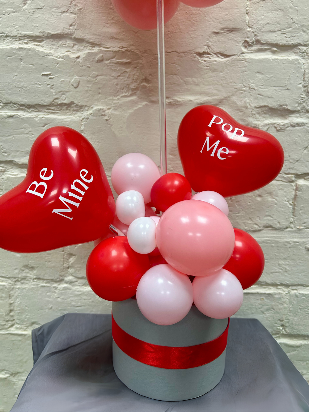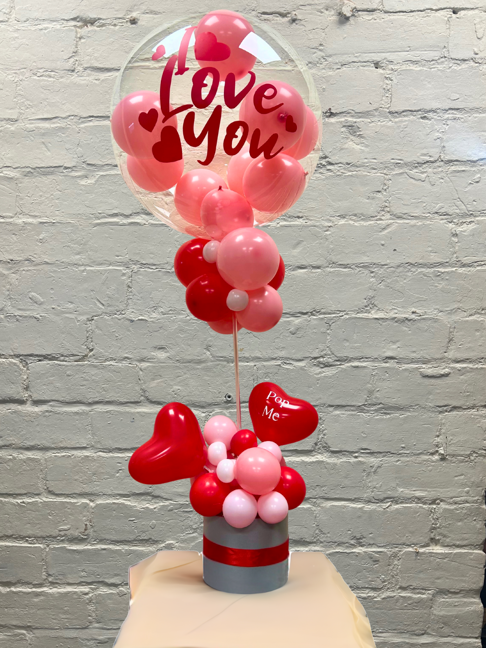 This show‑stopping Valentine’s piece features a giant clear bubble balloon filled with soft pink minis, topped with glossy red vinyl lettering that says Love You. It’s anchored by a coordinating cluster of reds, light pinks and whites, plus sweet heart balloons—one cheekily labeled Pop Me for that extra bit of fun. Everything sits on a chic, ribbon‑trimmed hat box for a clean, premium finish.