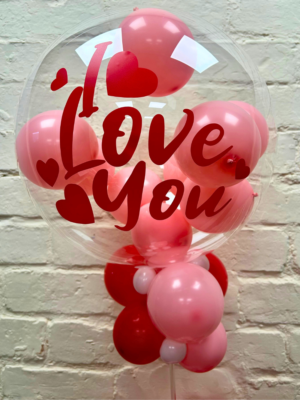 A stunning Valentine’s gift balloon featuring a clear bubble filled with soft pink balloons and bold red “I Love You” vinyl, finished with heart details and a playful “Pop Me” surprise.